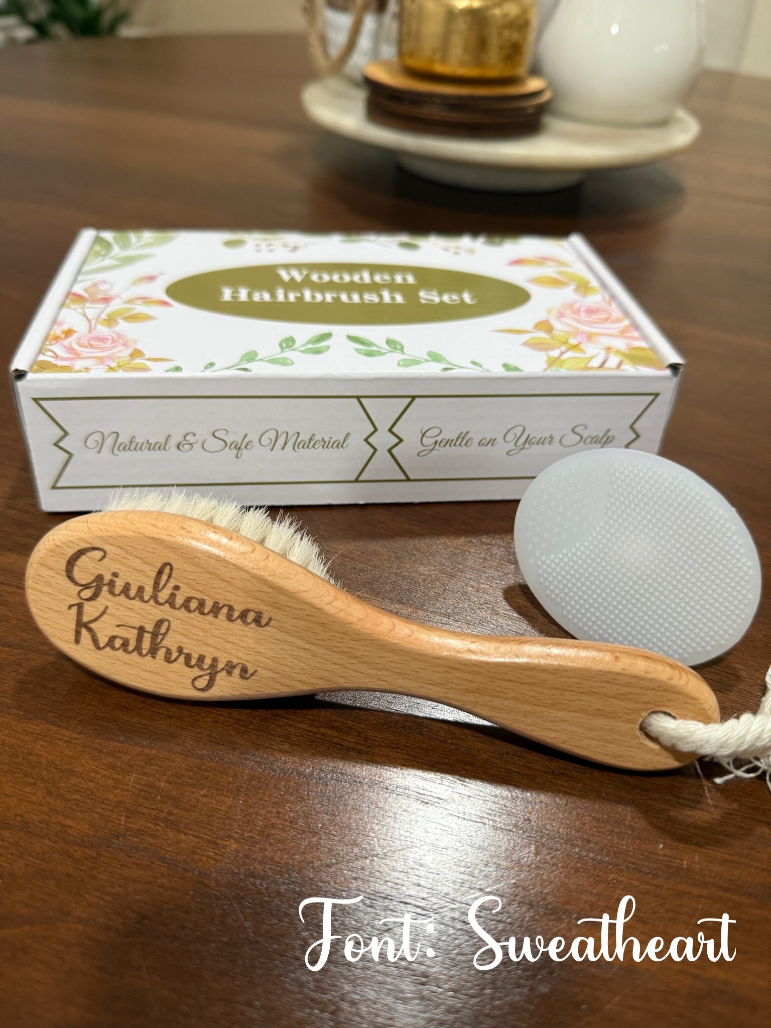 Our personalized baby wooden brush comes with a baby scrubber.